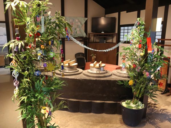 土間に七夕の笹を飾りました。願い事を書いていただく短冊もご用意しています。
