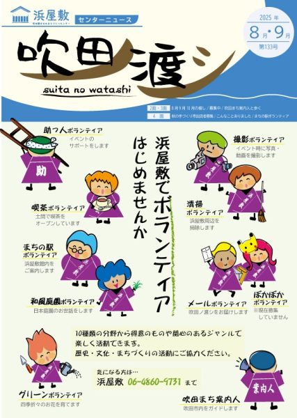 お知らせ センターニュース吹田ノ渡シ133号公開しました 2025年7月29日 【1面】浜屋敷でボランティアをはじめませんか【2面・3面】8月・9月・10月の催し【4面】秋の手づくり市出店者募集 / こんなことありました / まちの駅ボランティア一緒に活動しませんか センターニュース「吹田ノ渡シ」アーカイブ Tweet 関連