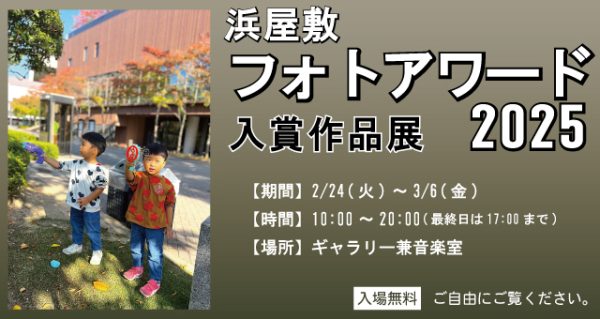 お知らせ 浜屋敷フォトアワード2025入賞作品展 2026年1月30日 浜屋敷フォトアワード2025の入賞作品を展示します。素敵な作品をぜひご覧ください。 期間|2/24(火)~3/6(金)時間|10:00~20:00(最終日は17:00まで)場所|浜屋敷 ギャラリー兼音楽室 入場は無料です。ご自由にご覧ください。 Tweet 関連