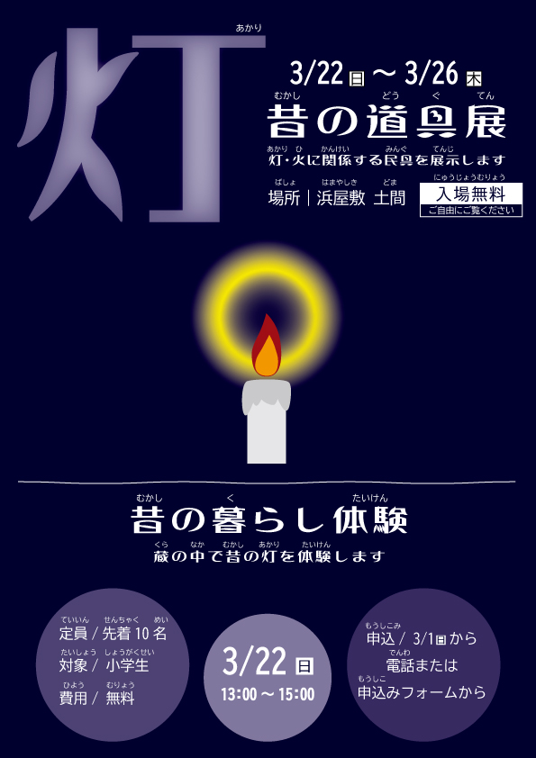 灯・火に関係する民具を土間で展示します。