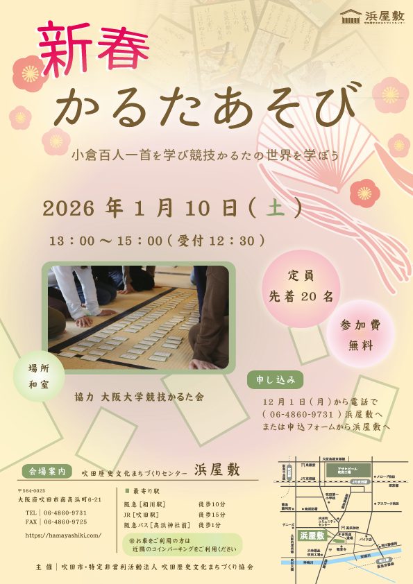 日時|2026年1月10日(土) 13:00~15:00 (受付 12:30~) 定員 |先着20名 費用 |無料 場所 |浜屋敷 和室 申込|12月1日(月)午前9時から電話で浜屋敷(06-4860-9731)または、申込フォームよりお申込みください。