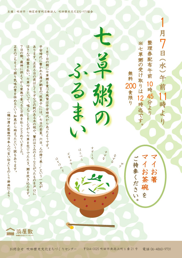2026年1月7日水曜日|11:00 AM - 12:00 PM 七草がゆのふるまい 吹田歴史文化まちづくりセンター『浜屋敷』 南高浜町6-21 1月7日の朝に七草粥を食べる風習は平安時代からあったようです。 正月のごちそうで… 無料