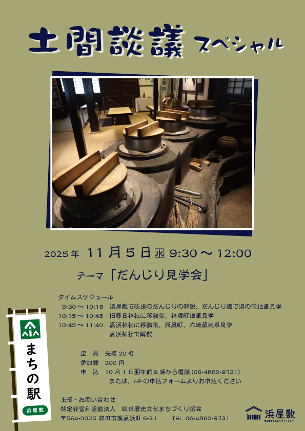 11月 5日水曜日|9:30 AM - 12:00 PM 土間談議スペシャル 吹田歴史文化まちづくりセンター『浜屋敷』 南高浜町6-21 だんじり見学会 好評につき定員に達しました。 浜屋敷でだんじりの解説を聞き、浜の… ¥200