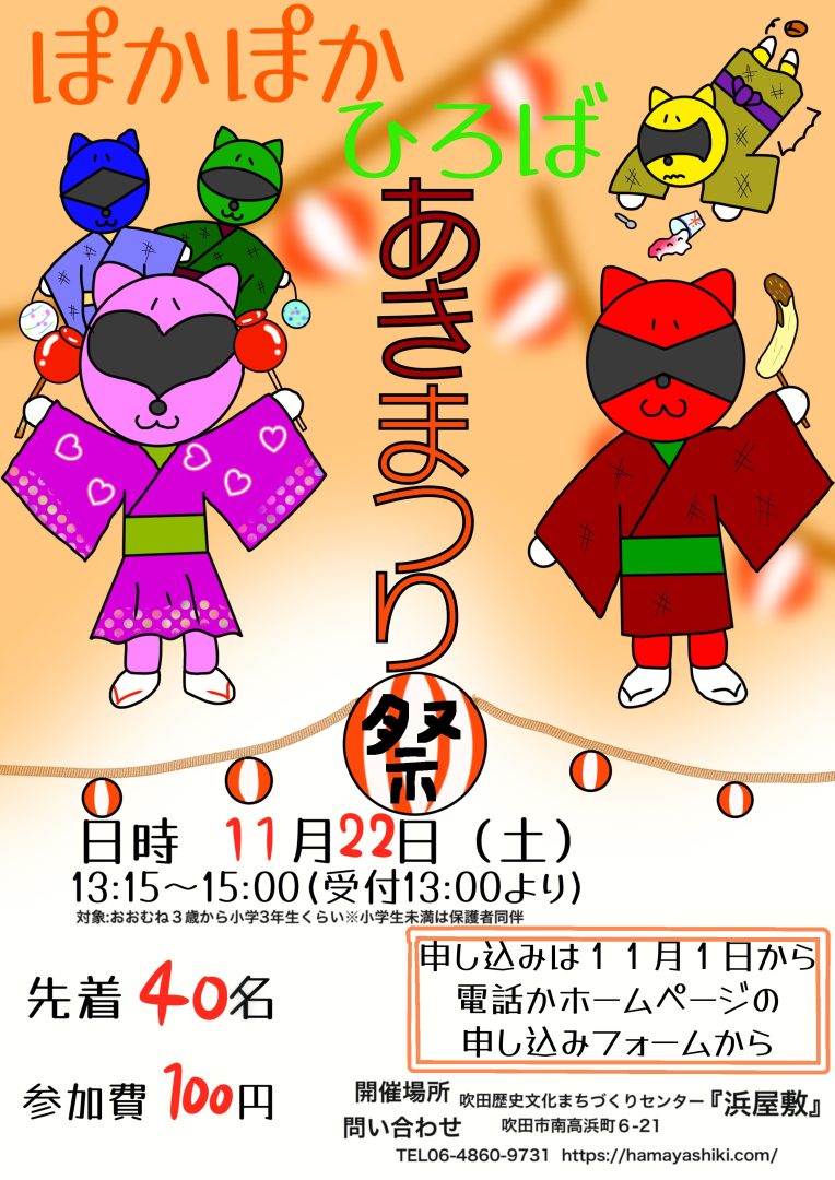 11月 22日土曜日|1:15 PM - 3:00 PM ぽかぽかひろば 吹田歴史文化まちづくりセンター『浜屋敷』 南高浜町6-21 ぽかぽかまつり 好評につきキャンセル待ちになりました。 キャンセル待ちはお電話で… ¥100